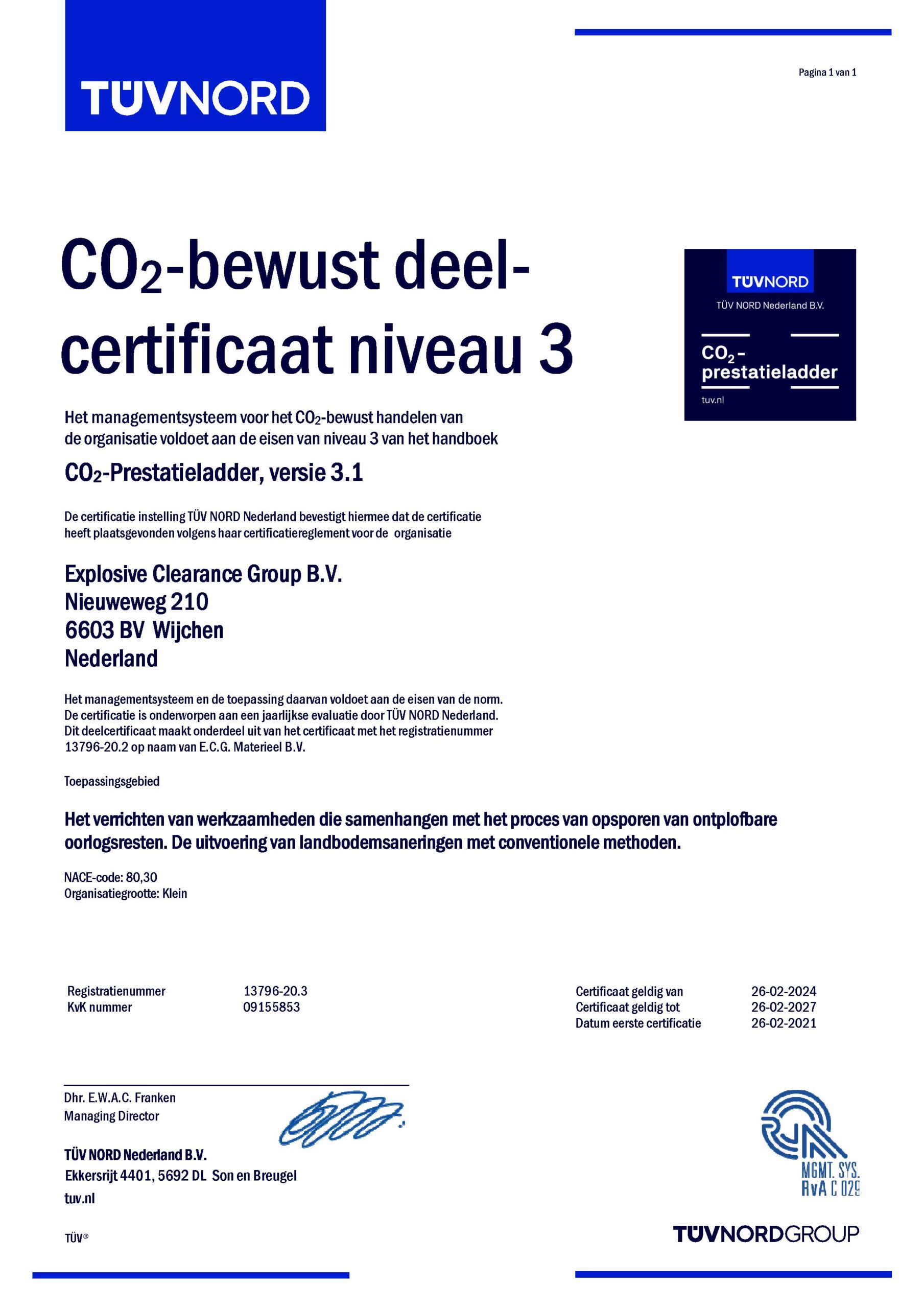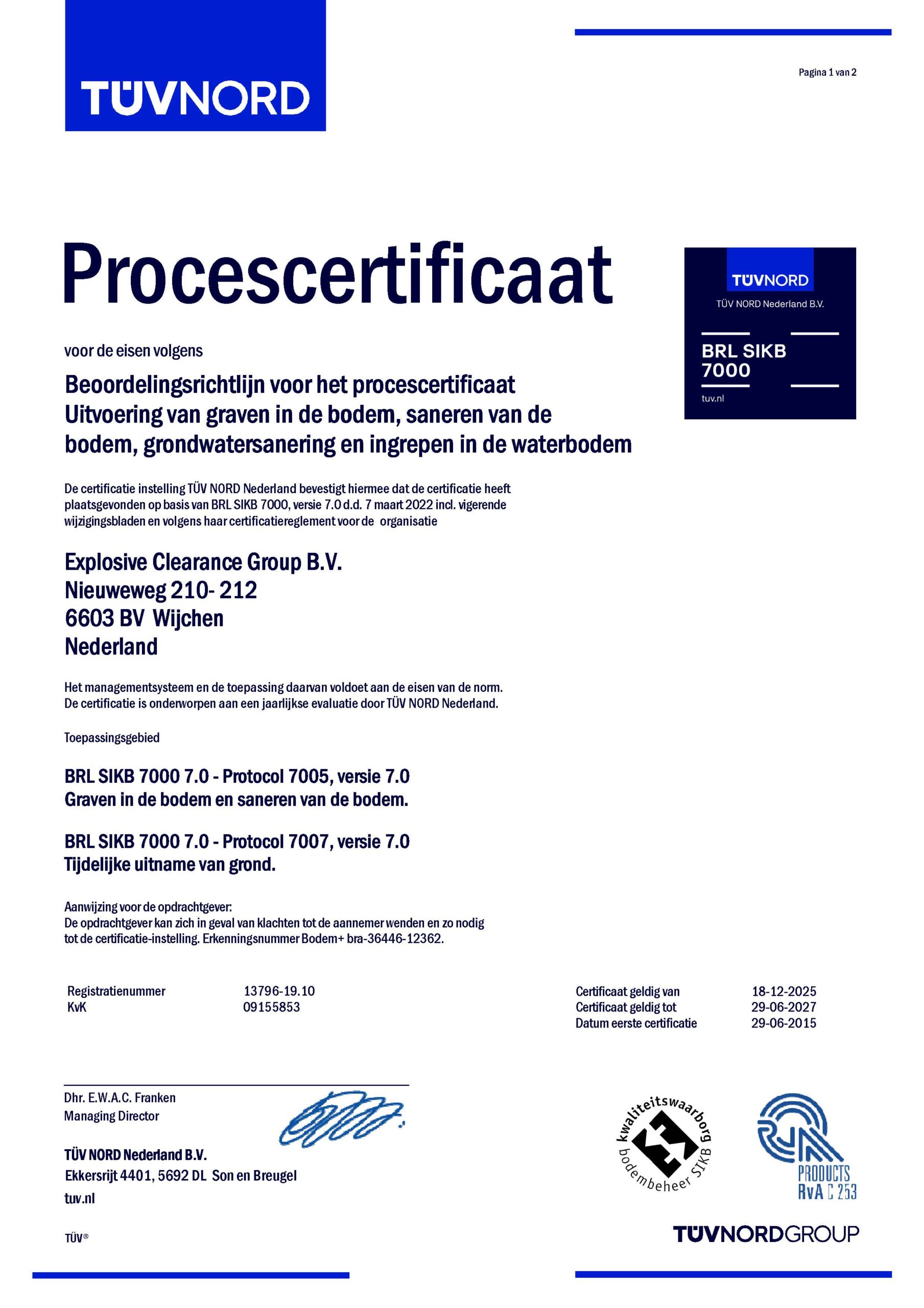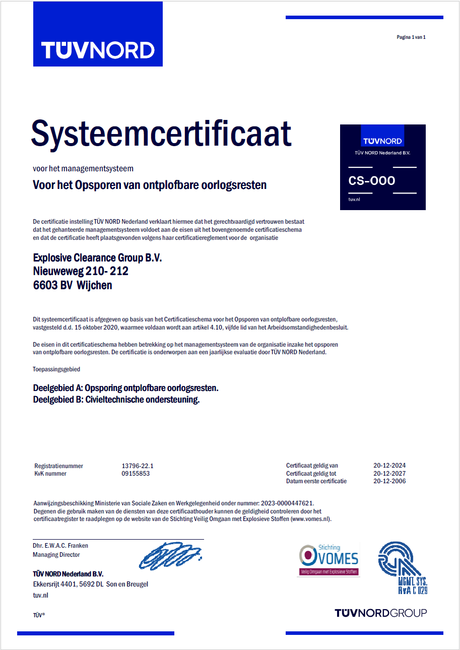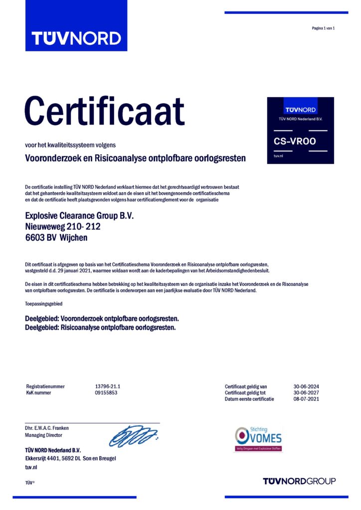 Explosive Clearance Group (ECG) is volledig gecertificeerd conform het Certificatieschema voor het Opsporen van ontplofbare oorlogsresten (CS-OOO). Tevens werkt ECG conform de richtlijnen van het toekomstig vrijwillig Certificatieschema Vooronderzoek en Risicoanalyse ontplofbare oorlogsresten (CS-VROO). Bij ECG kunt u terecht voor het volledige explosieven opsporingsproces: van het Vooronderzoek tot en met het benaderen en veiligstellen van explosieven. Dit alles zowel in de landbodem als in de waterbodem. Zo garanderen we dat uw project veilig en zorgvuldig wordt uitgevoerd.