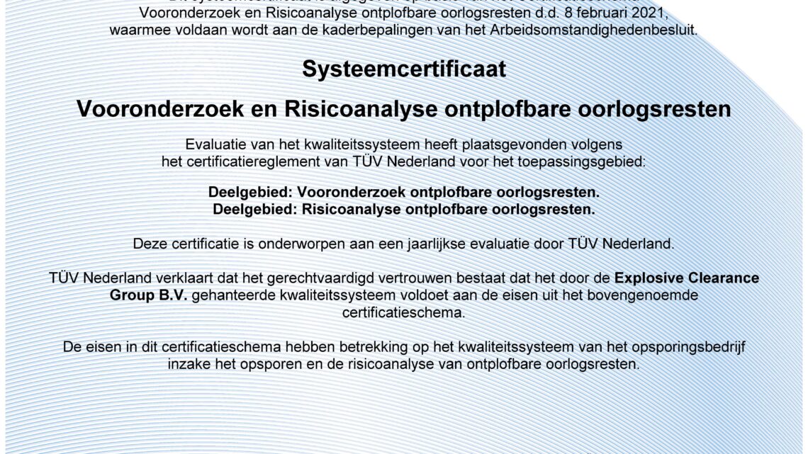 Met gepaste trots beschikt ECG sinds heden over het Certificaat voor het Vooronderzoek en Risicoanalyse. Met het behalen van het certificaat willen wij de kwaliteit die iedereen van ons gewend is waarborgen en tonen. Met het behalen van het certificaat is Explosive Clearance Group één van de eerste bedrijven die beschikt over het certificaat!